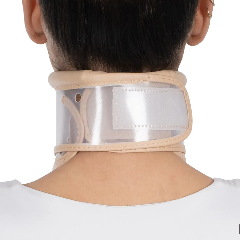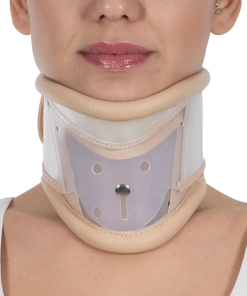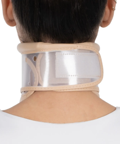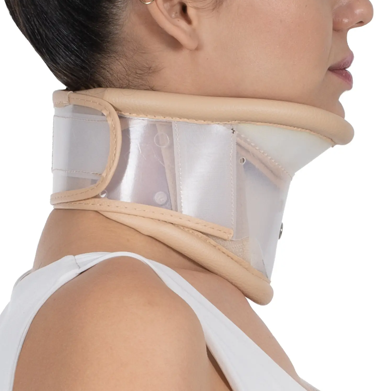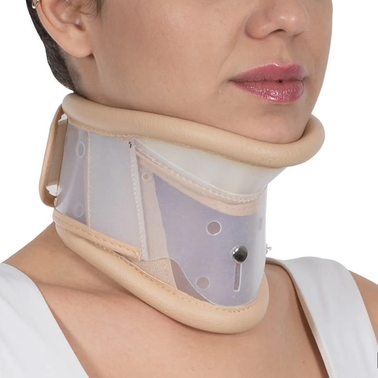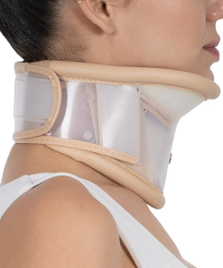Anatomically designed to the neck form and manufactured from plastic material. Chin support limit neck movement. Height is adjustable with velcro fasteners. Stabilizes the neck area and relieves the pressure on the neck muscles.
