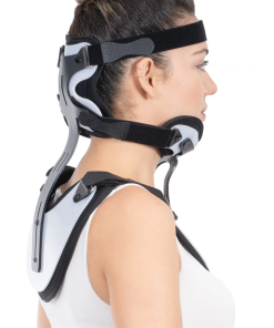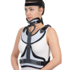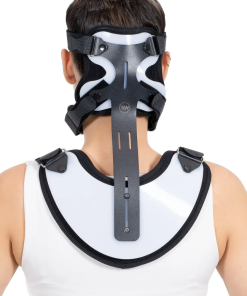 It is 2-pieces neck collar and body orthosis. The inside is covered with a sponge terry fabric and the outer surface is made of polyethylene material and is supported with aluminum. It fixes the chest area and restricts the extension, flexion, lateral flexion and rotation movements of the neck.
